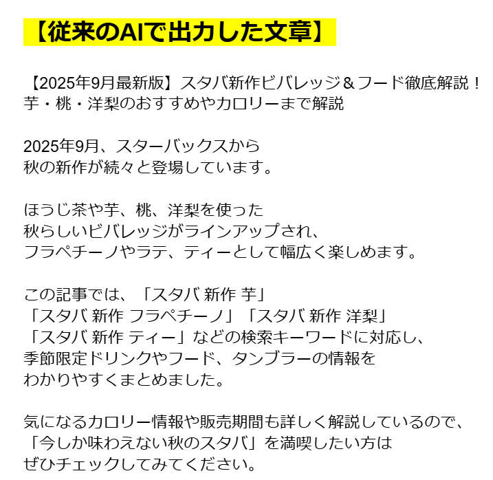 ここまで聞いて、「じゃあAIで記事を作ればいいでしょ」と思う人もいるかもしれませんが、